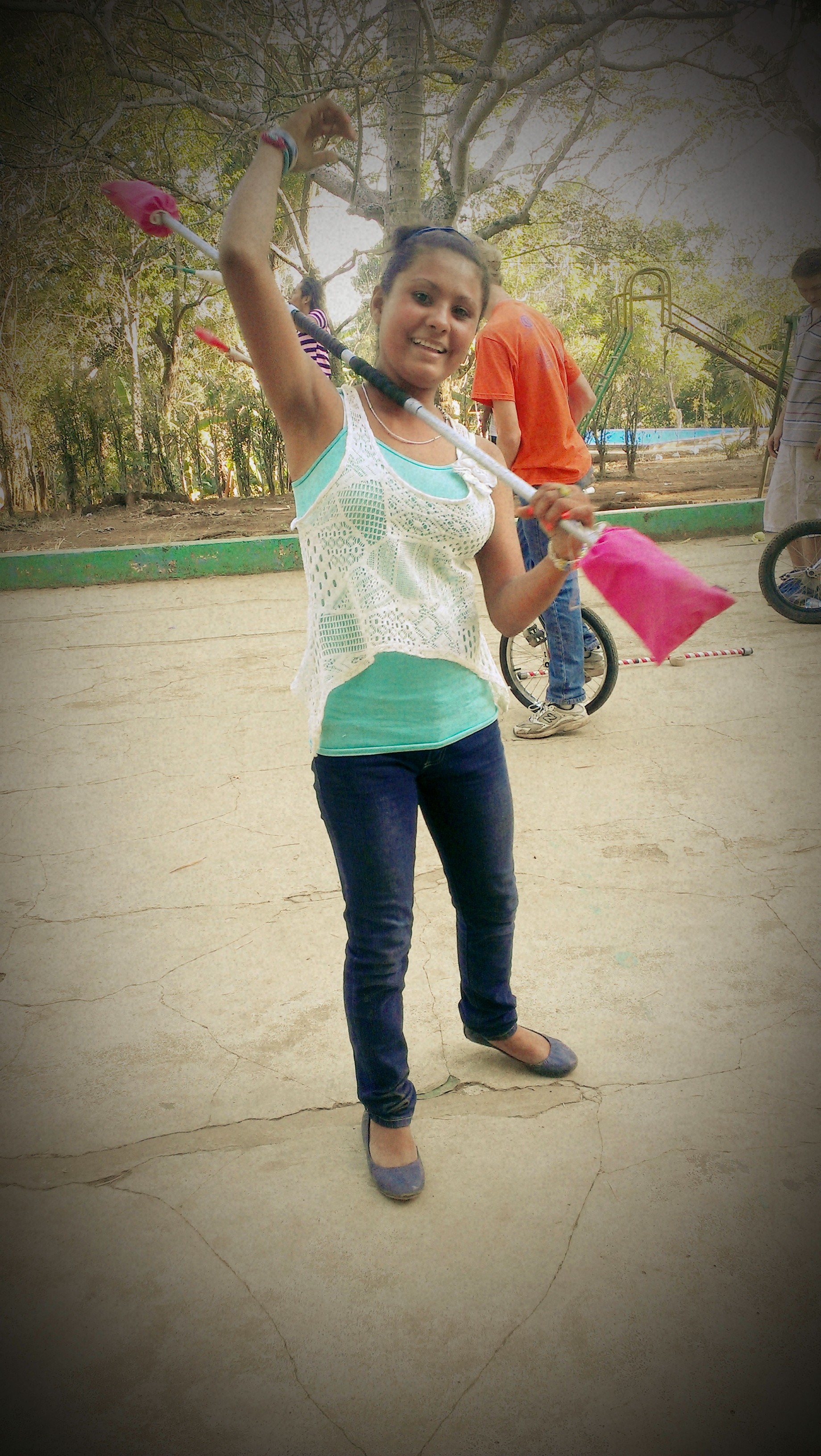 I originally found out about PWB through Rob Thorburn, a wonderful spinner/juggler/performer friend from Scotland that has been on the spinning scene forever. He had just come back from organizing the first PWB tour in Nicaragua in 2013. He talked about teaching kids poi and staff and acrobalance in Nicaragua. My immediate reaction was “That sounds exactly like what I need to do!” Gaining fluency in Spanish has been a lifelong goal, and since 2006 I felt a huge draw to Nicaragua after studying the country a bit in school. I had already been teaching poi and staff for many years, and the idea of bringing these specific arts to kids immediately resonated with me. I also liked that the project wasn’t just about Circus, but it embraced performing arts as a whole. That made me feel that I had enough to bring to the table with my acting & dance background, and my flow-arts based work.